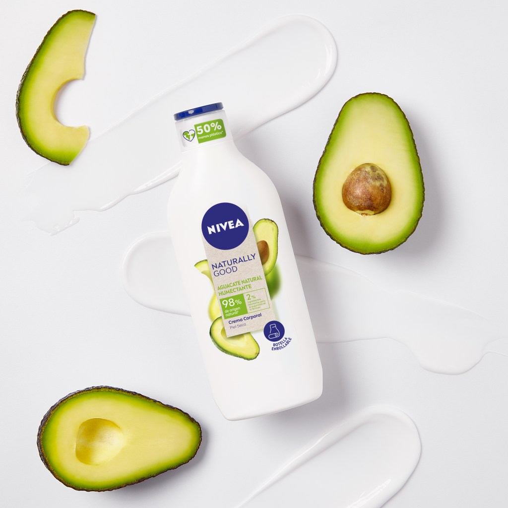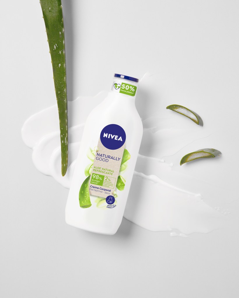 La NUEVA línea Naturally Good de NIVEA está hecha con fórmula vegana rica en nutrientes que le devuelven a tu piel justo lo que necesita: Humectación profunda, suavidad inmediata y natural, creada con hasta 99% de ingredientes naturales, al mismo tiempo que cuida del planeta ya que sus envases son 100% reciclables y sus botellas están hechas con 50% menos plástico.