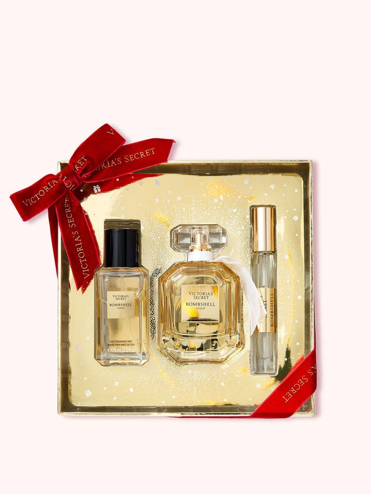 2.- Gift Set Bombshell Gold: ¡Qué mejor regalo para una mujer que una fragancia inspirada en el espíritu navideño! Este increíble Gift Set contiene Eau de Parfum, roller ball y un mist corporal para que lleves a todos lados y enamores a quien sea perciba tu delicioso aroma con el efecto de perfumado en capas que permite una duración más larga e intensa.