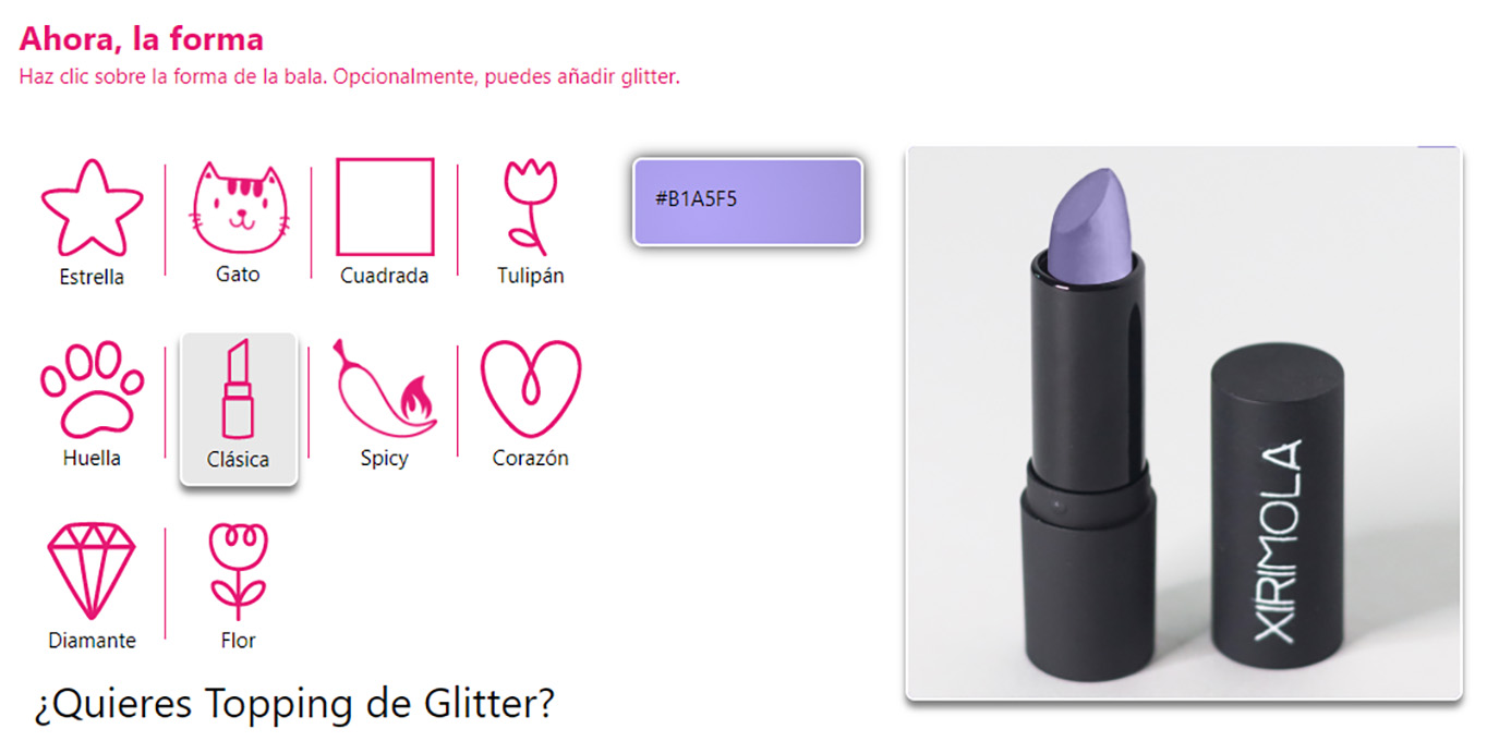 Esta es de mis opciones favoritas, aquí eliges la forma tu labial, puede ser de gatito, clásica, huella, estrella, cuadrada, corazón, tulipan, spicy (forma de p*ne, esta es ideal para despedidas de soltera), diamante o flor. En esta sección también esta la opción de agregar glitter, para darle un toque diferente a nuestro labial.