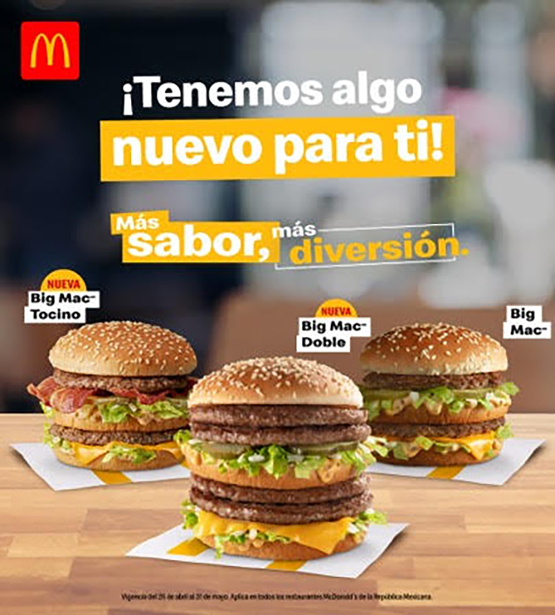 McDonald’s México lanzará la campaña «Más sabor, Más diversión», la cual ofrece dos nuevas presentaciones de su icónica hamburguesa “Big Mac”: Big Mac Doble y Big Mac Tocino.