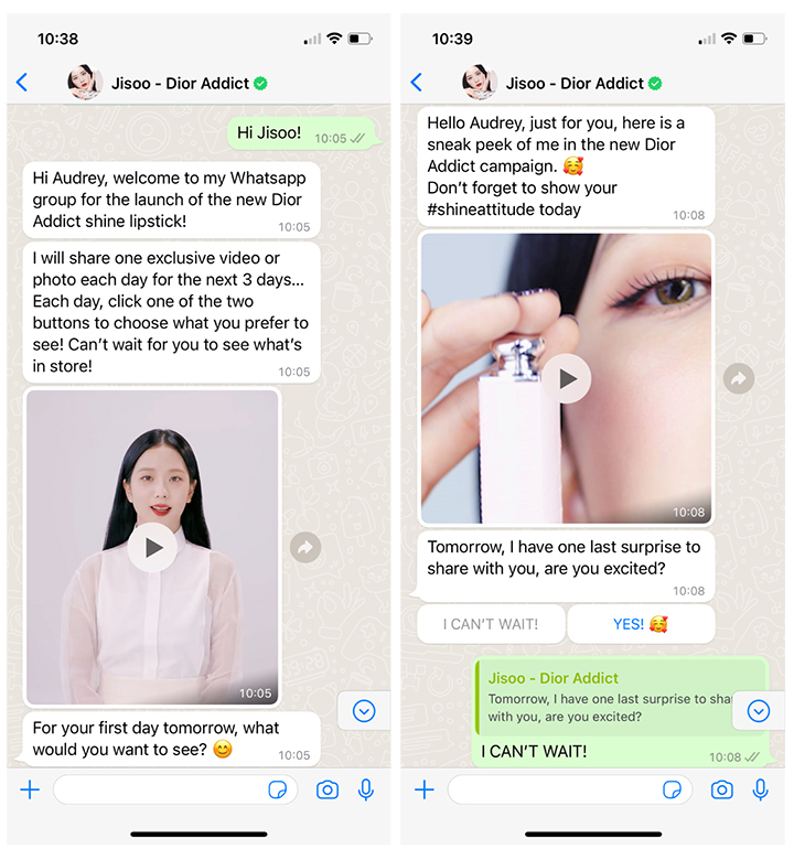 Los clientes están invitados a formar parte de la experiencia a través de las historias de Instagram de @diorbeauty, donde Jisoo ha ofrecido a los seguidores la oportunidad de unirse a su “grupo exclusivo de WhatsApp”. Desde allí, los clientes son llevados a una página de inicio dedicada donde pueden registrarse para interactuar con el chatbot de Jisoo a través de WhatsApp antes del lanzamiento del nuevo lápiz labial Dior Addict shine. Los miembros eligen el tipo de contenido que desean recibir, desde videos temáticos hasta imágenes exclusivas detrás de escena de la vida de Jisoo como embajadora de Dior.