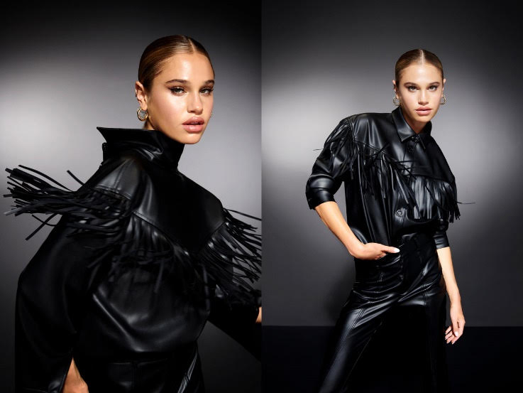 El segundo bloque oscila hacia una gama de colores más neutra donde los tonos negro, crudo y gris se asocian también al faux leather y el punto con el algodón más delicado para ofrecer piezas con un guiño western refinado. Así encontramos no solo jerséis y faldas de punto, sino también vestidos, sobre camisas y pantalones faux leather donde aparecen los flecos como el detalle que otorga personalidad a las piezas de la colección. Todo acompañado por un conjunto de sobre camisa y falda a cuadros que son el colofón del segundo drop reuniendo las tendencias más top de la temporada.