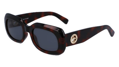El frente rectangular modificado y las proporciones voluminosas de estas gafas de sol de resina de origen vegetal se presentan en una variada paleta de colores, incluido el naranja transparente brillante elegido para la campaña de publicidad. También en los tonos de moda verde y rosa, las opciones clásicas de negro y marrón, todas ellas combinadas con cristales lisos. Las anchas varillas muestran el medallón metálico dorado con el caballo de Longchamp, un icono que subraya la identidad de la marca.