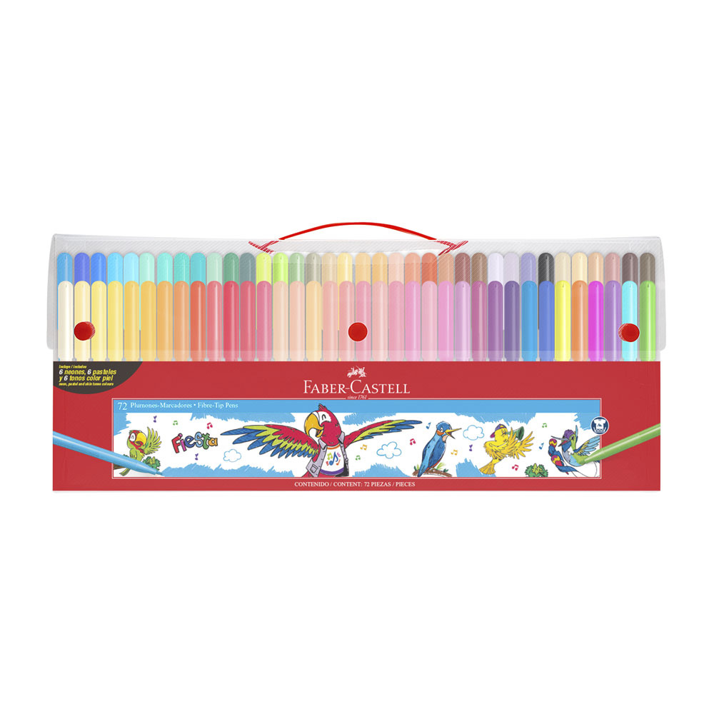 Los plumones Fiesta 45 de Faber-Castell impresionan por sus vivos colores, que permiten llevar a cabo una variedad de ténicas y mezclas, que dan lugar a la creatividad y a la diversión sin limite. La gama de 72 colores (que también se venden por separado), incluyen 6 tonos neón, 6 pastel y 6 piel. Su tinta al agua a base de colores alimentarios los hace no-tóxicos y que la ropa o la piel no se manchen. Tienen diseño contemporáneo y espacio en blanco para colocar el nombre del usuario.