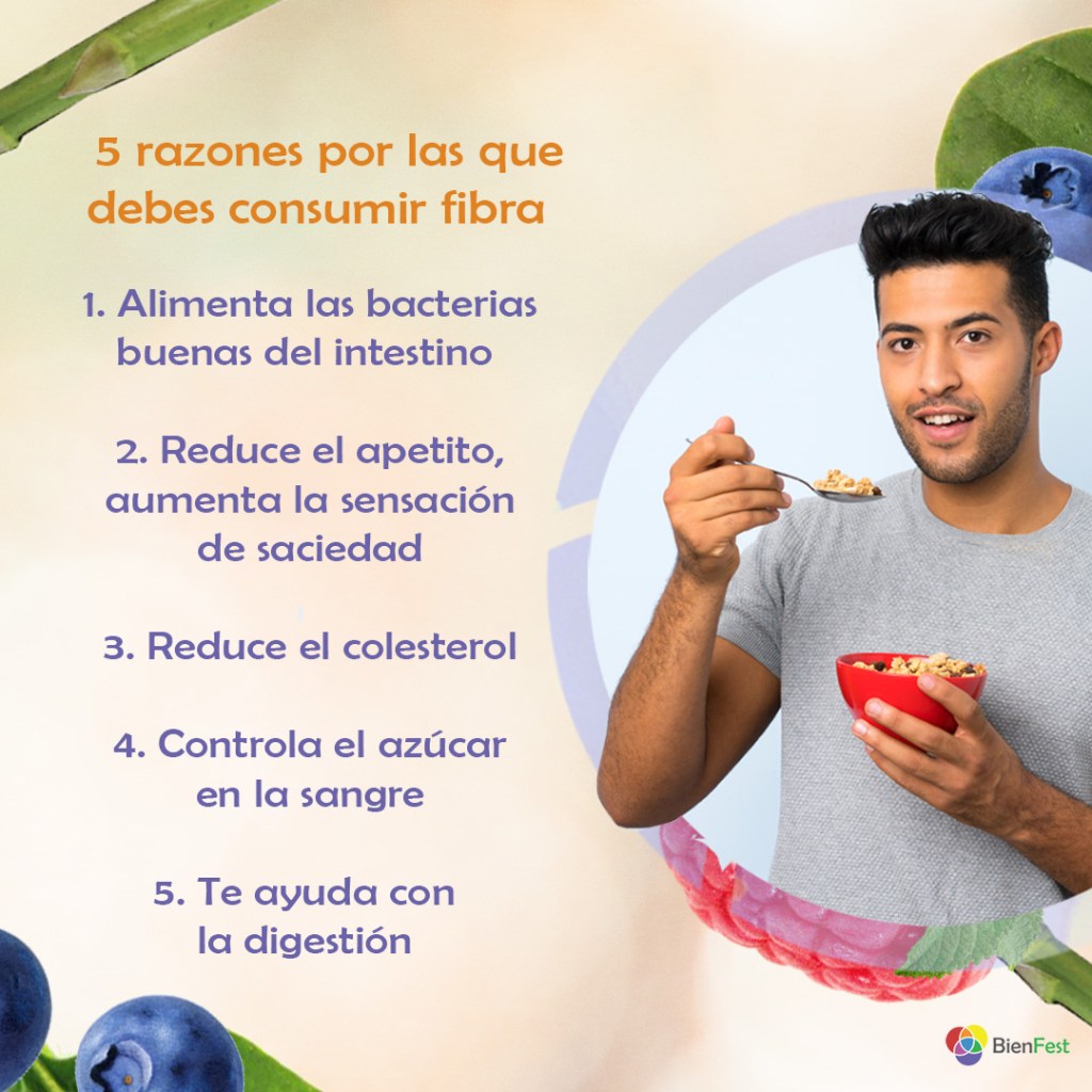 Consumir fibra a diario es bueno para tu salud, ya que puede ayudar a reducir el riesgo de desarrollar obesidad, enfermedades cardíacas, diabetes, alimenta las bacterias anti inflamatorias del intestino, regula las hormonas y se ha demostrado que aumenta la longevidad.