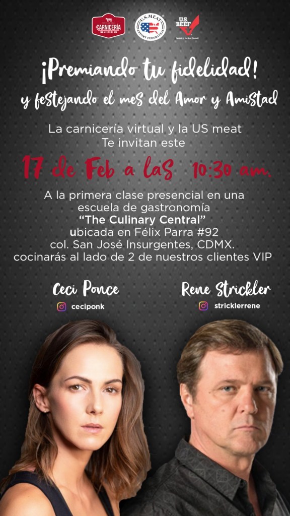 Junto con los actores Cecilia Ponce y René Stricker, un grupo comensales podrá participar y convivir con ellos en una clase Masterclass impartida por ellos en The Culinary Central en la Ciudad de México este próximo 17 de febrero. Ambos prepararán deliciosos platillos junto con los selectos cortes de U.S Meat, que se encuentran disponibles dentro del catálogo de La Carnicería Virtual.