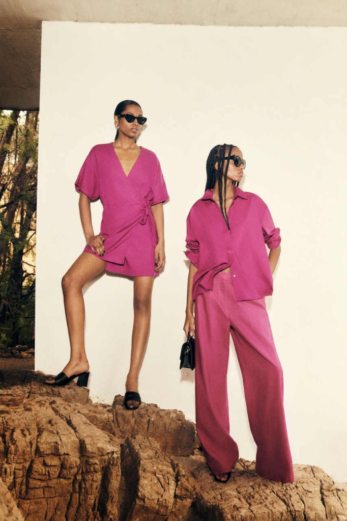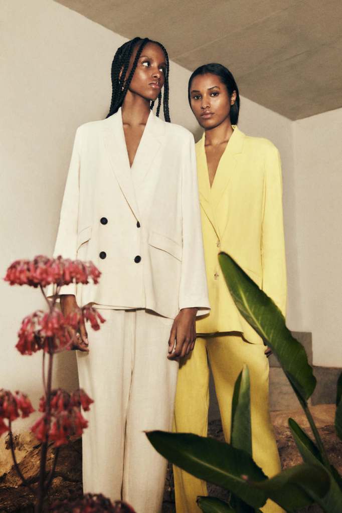 En la nueva colección encontramos piezas ligeras y vaporosas como los vestidos midi o cortos cruzados, el estilo rústico plasmado en conjuntos de blazer, pantalón de vestir y chalecos, detalles como bordados y volantes en camisetas y camisas, así como una selección de piezas de punto calado como tops y chaquetas. También trajes masculinos muy fluidos, vestidos de corte sastre o de inspiración caftán, así como una serie de chaquetas y tops de aires y detalles románticos. En resumen, un decálogo de imprescindibles que navega en los tonos blancos, tierra y negro con pequeños toques en color fucsia, amarillo o verde agua que ahondan en su carácter primaveral.