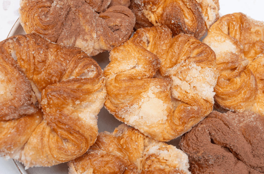 - Kouign-amann: Este pan de origen bretón, cuyo nombre significa «pastel de mantequilla», se distingue por su exterior caramelizado y crujiente, con un interior hojaldrado y suave. En Alcázar, está disponible en tres versiones: natural y relleno de crema de almendra.