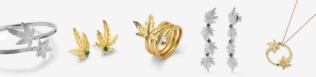 La colección incluye sortijas con hojas envolventes y piedras centrales que simbolizan el ciclo vital, pulseras y colgantes que celebran la renovación constante de la naturaleza, pendientes articulados en cascada, broches que representan el movimiento fluido de las ramas