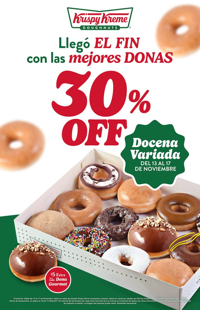 ¡Llegan los días de grandes promociones y Krispy Kreme está listo para hacerlo aún más antojable! Durante esta gran temporada de ofertas, la marca tendrá una promoción para todos sus Krispylovers: podrán disfrutar de un 30% de descuento en docenas de variedad, una deliciosa oportunidad para compartir momentos especiales con familiares y amigos